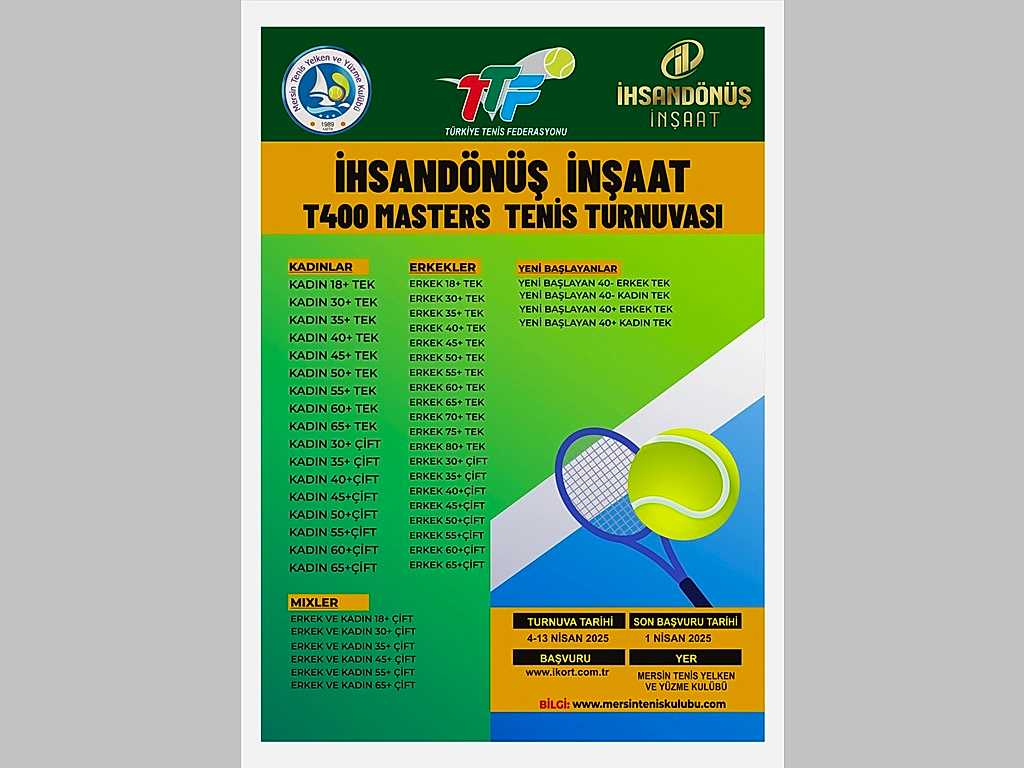 Türkiye Tenis Federasyonunun 2025 yılı faaliyet programında yer alan İHSANDÖNÜŞ İNŞAAT T400 MASTERS TENİS TURNUVAMIZ 4 nisan 2025 cuma günü eleme maçları ile başlamış olup 13 nisan 2025 Pazar günü oynanan final maçları ve yapılan ödül töreni ile son bulmuştur.